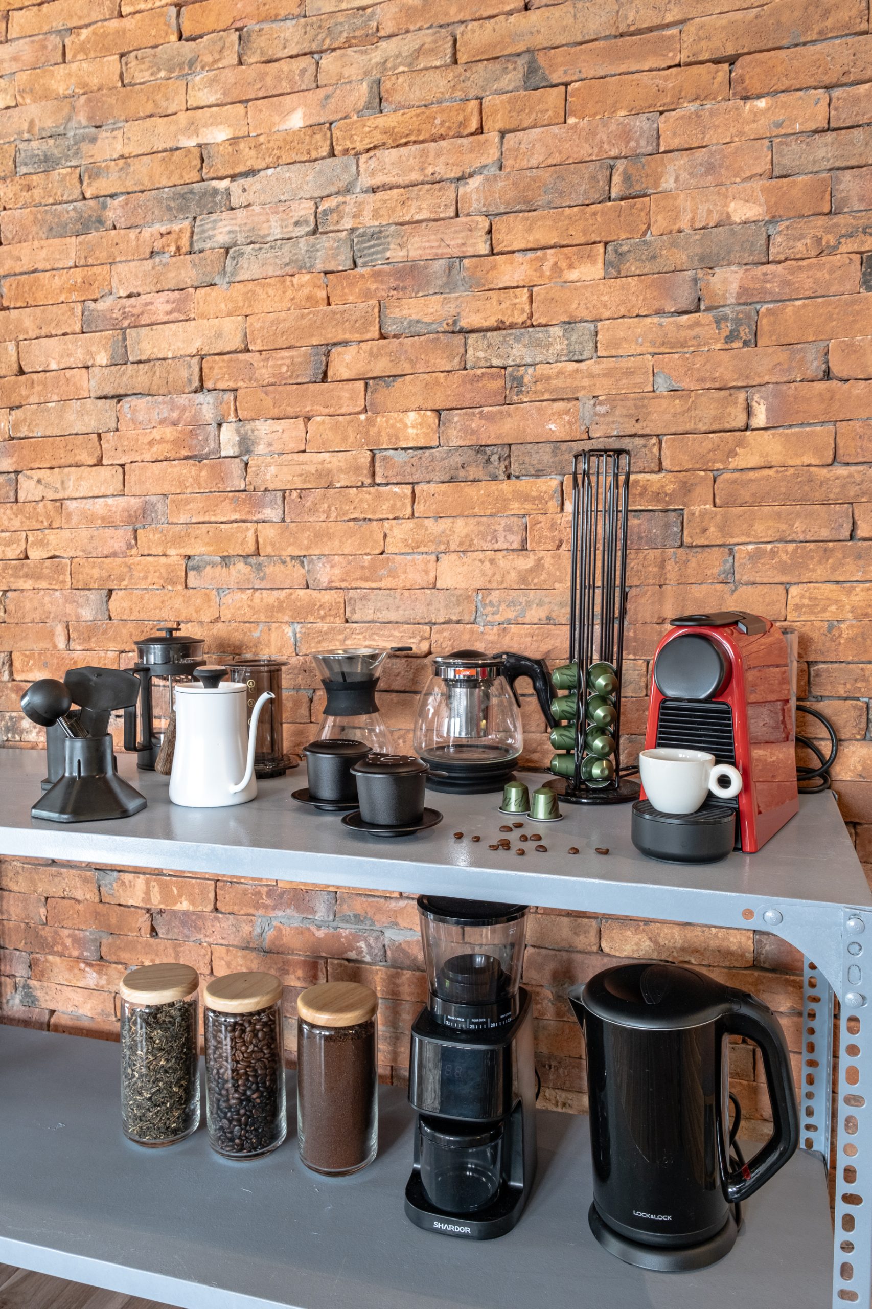 Highlights include our vinyl player with LPs, a movie projector, and a huge coffee bar with Nespresso machine and several coffee options (beans included!)