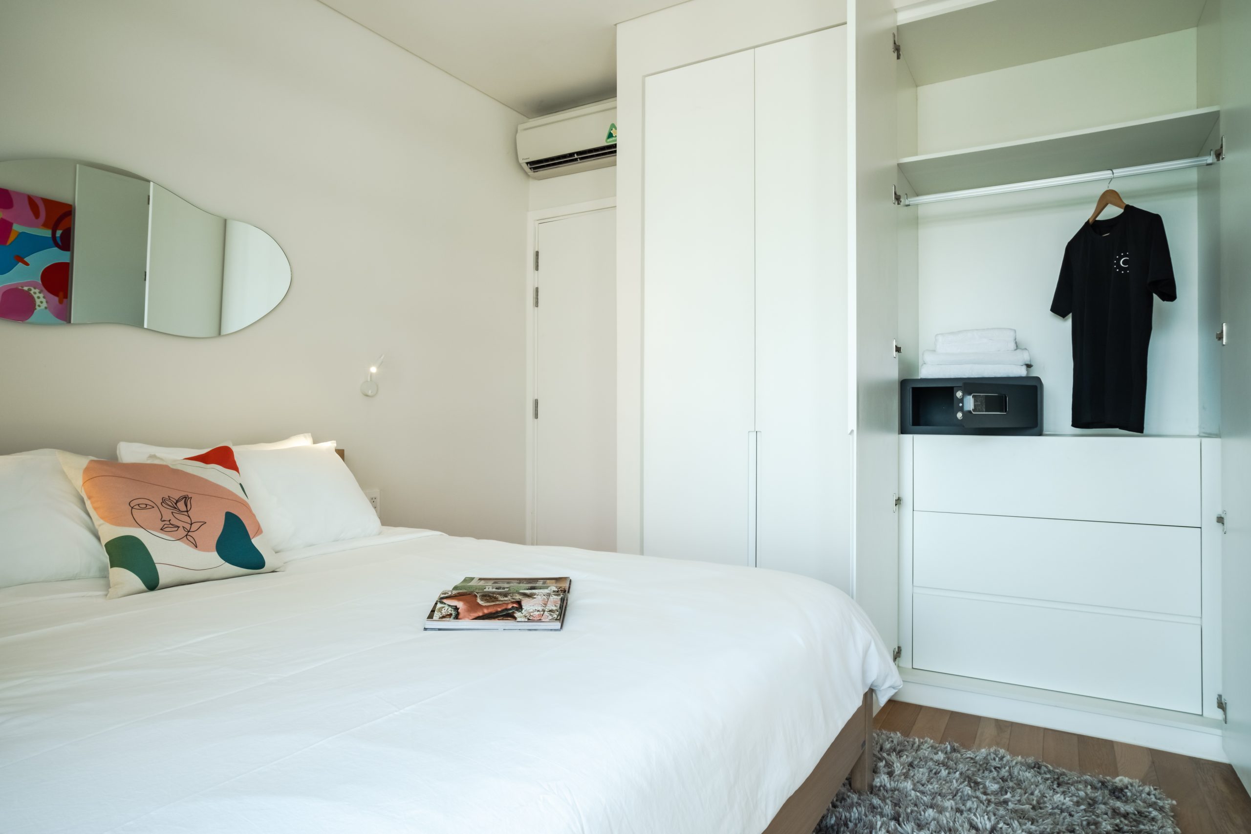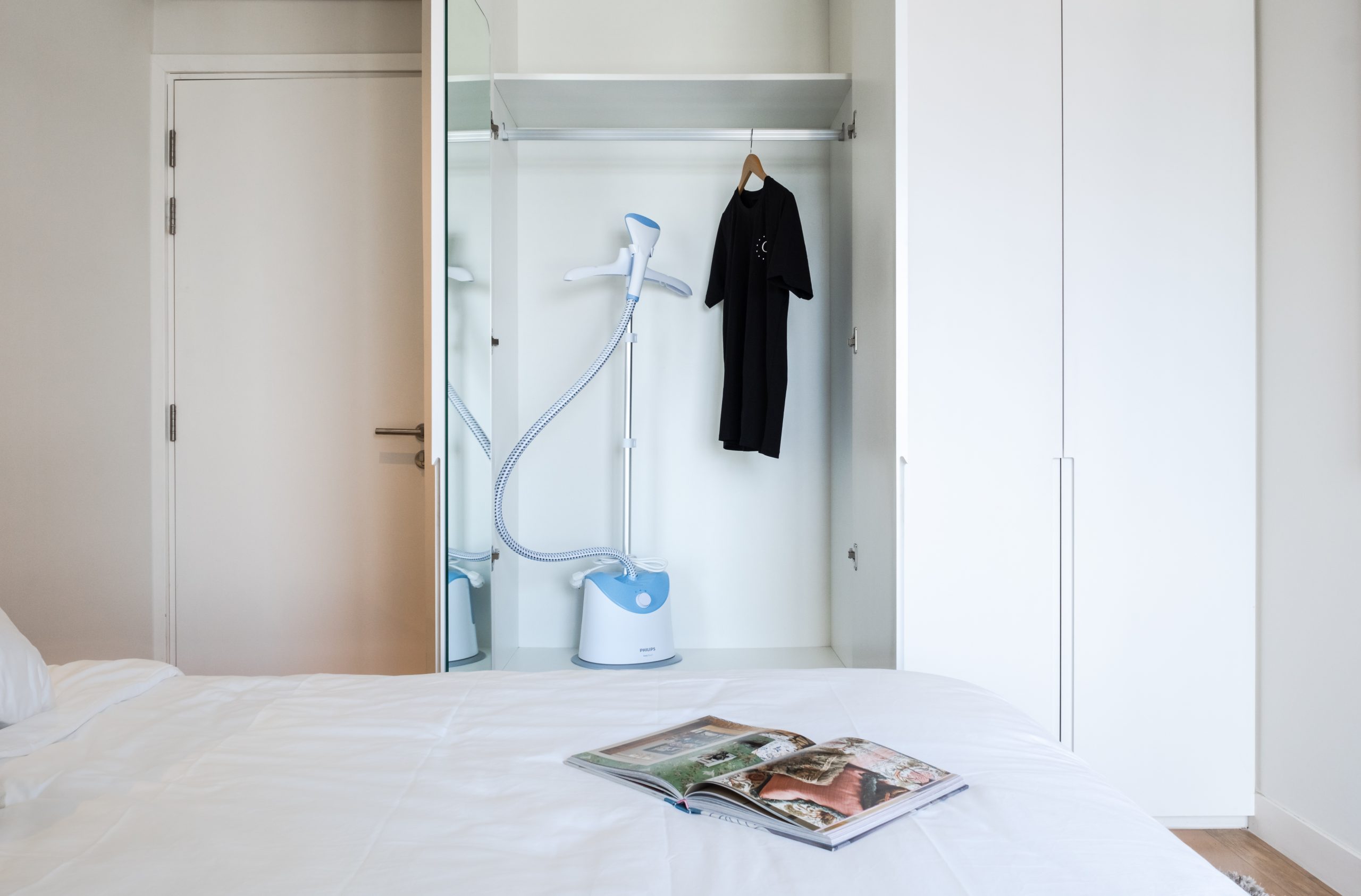 The bedroom has a king bed with bedding and towels sourced from a hotel supply company. We also provide a standing garment steamer and a laptop safe.