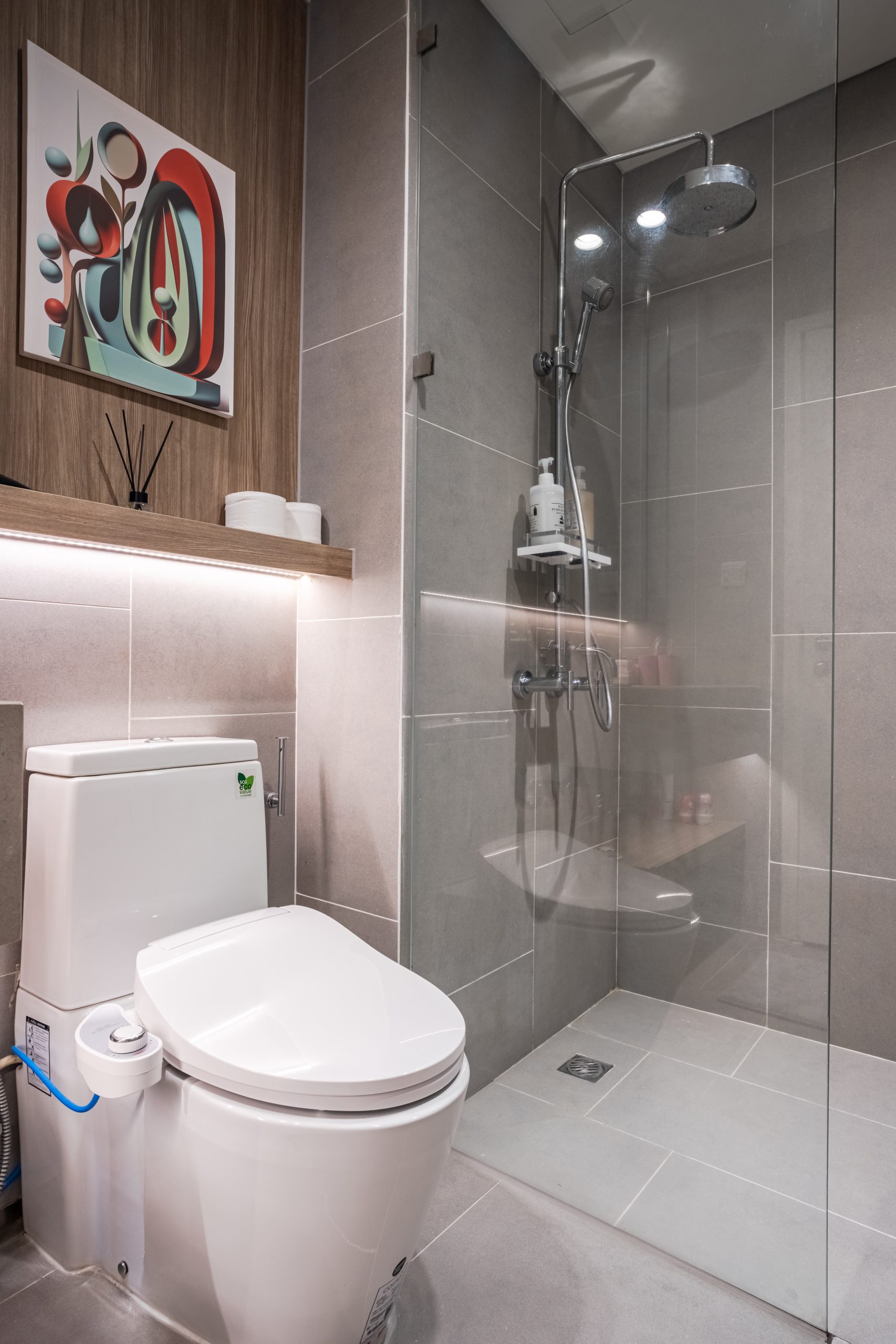 The bathroom features a high-volume rain shower, bidet and step stool. Toiletries are provided including toothbrush, q-tip, body wash, and shampoo and conditioner.