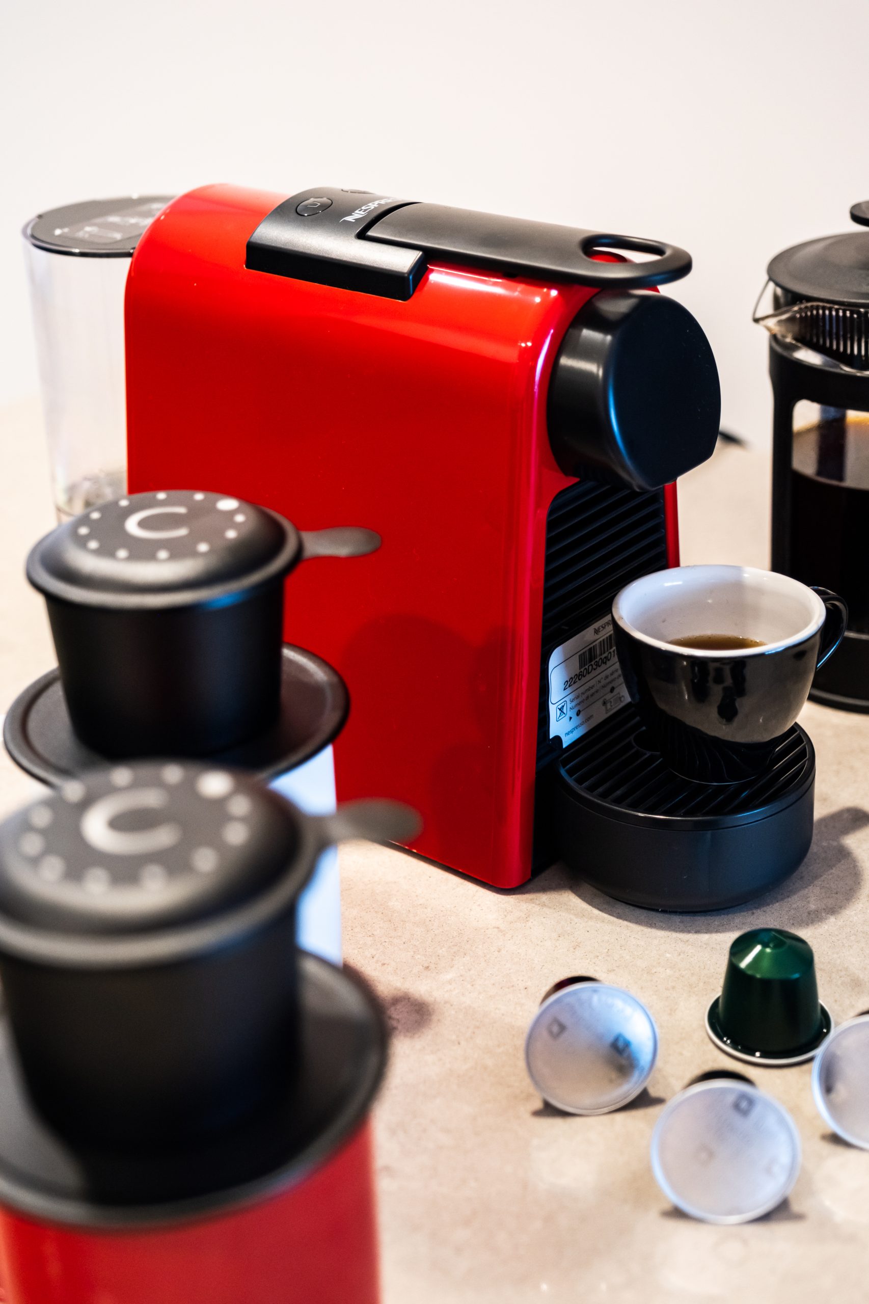 We’ve set up a beautiful coffee bar with an assortment of coffeemakers and a Nespresso machine: