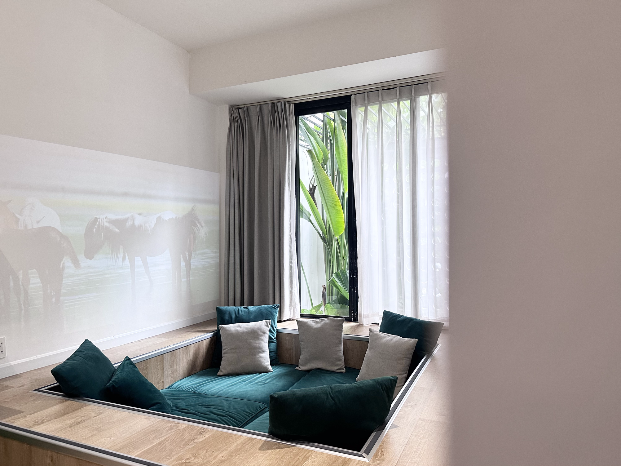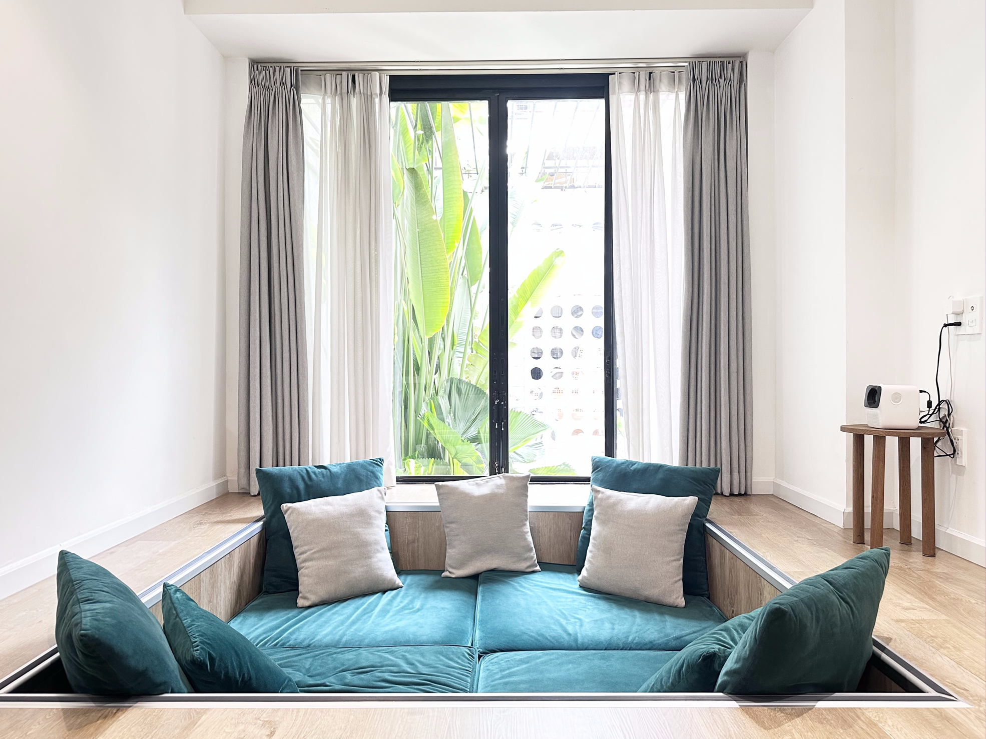 The best part of this unit is our “living room,” a sunken lounge filled with plush pillows and cushions that opens into a small private garden. It really is the perfect spot to chill and read a book.