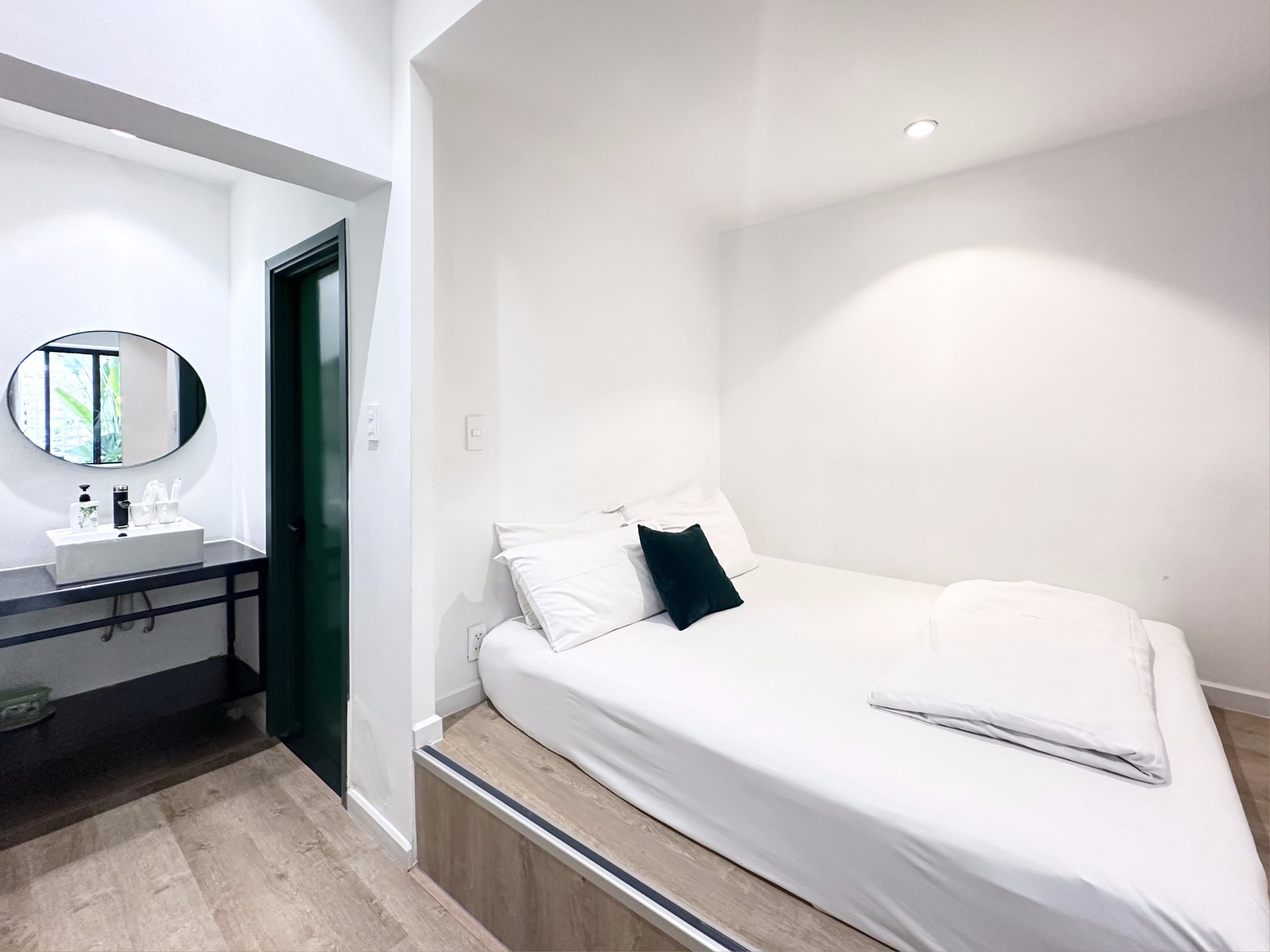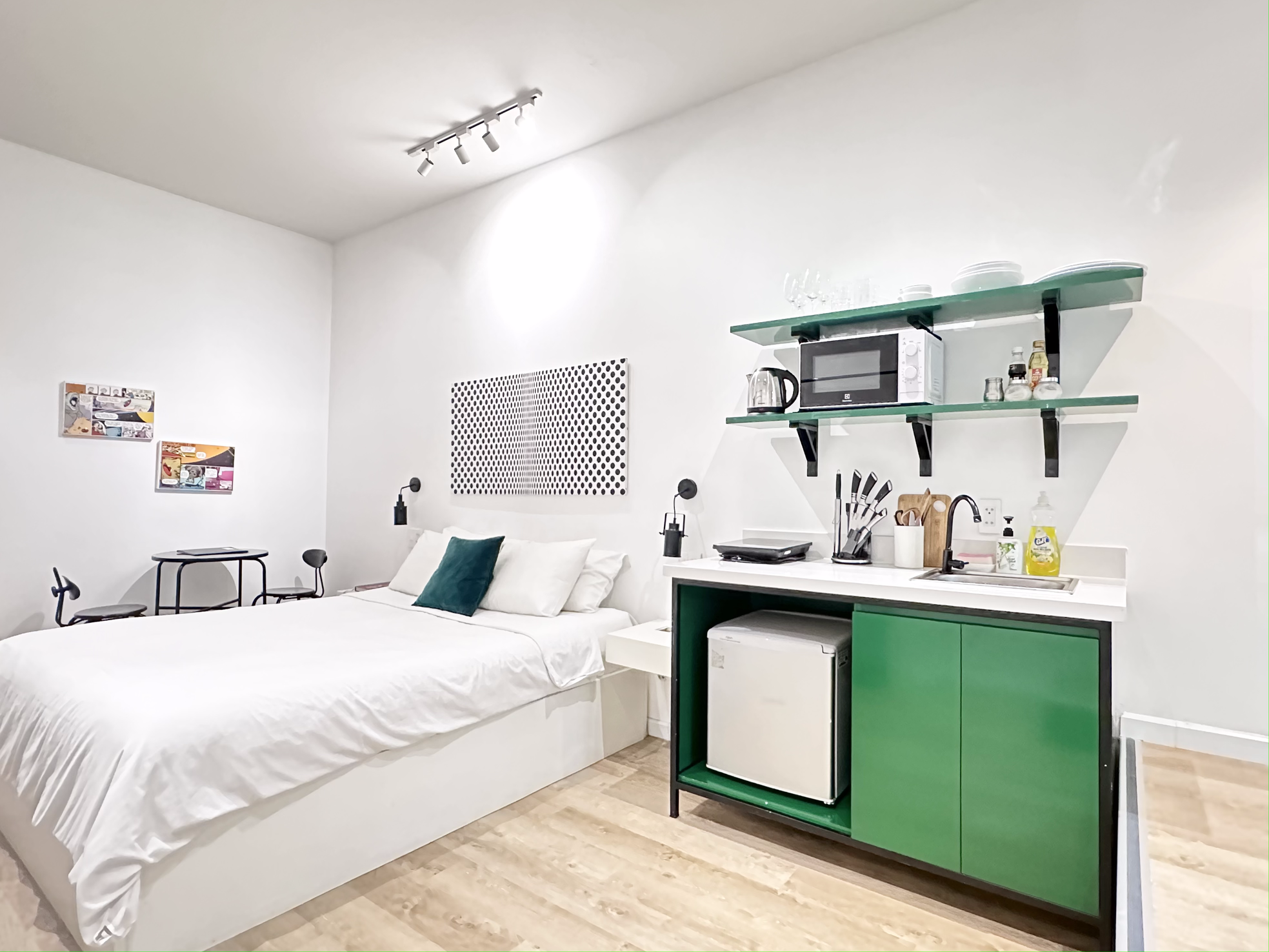 Designed for short or long-term stays, the minimalist studio features 2 queen beds, full kitchen & ensuite bathroom with rain shower.