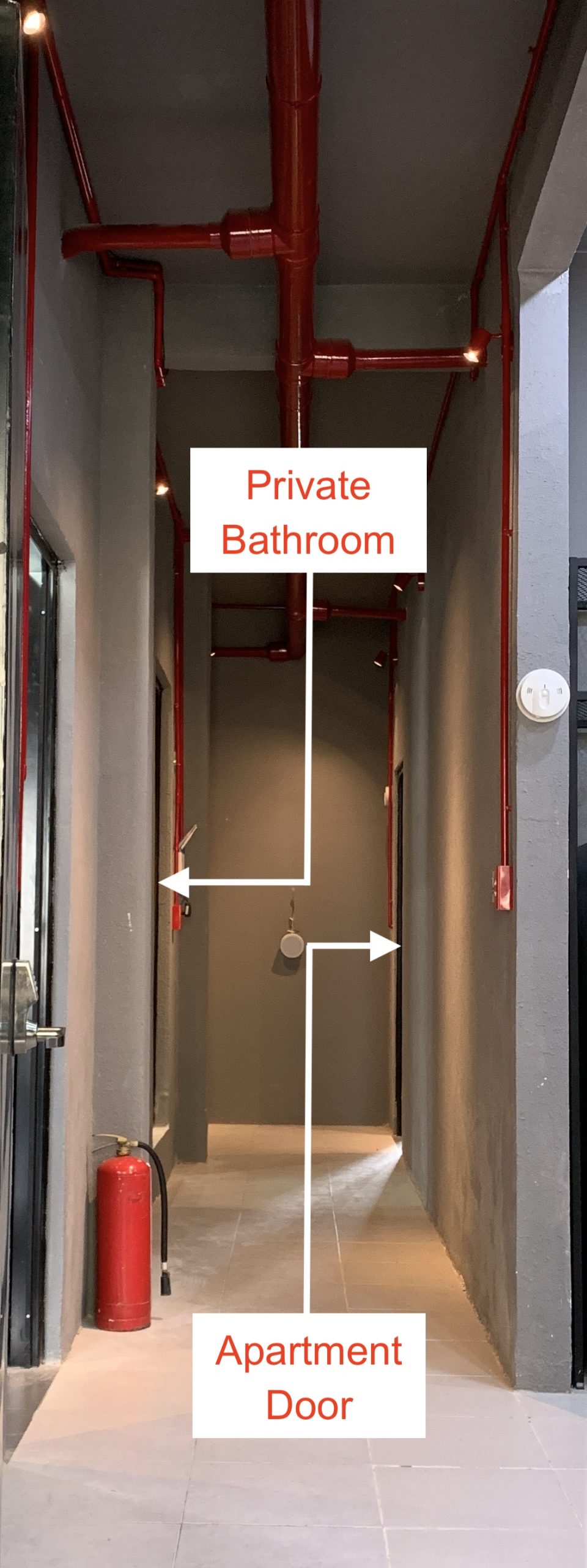 The bathroom is private, but is outside of the unit. It’s in the hallway right across from the entrance door. The bathroom can be locked and is not shared.