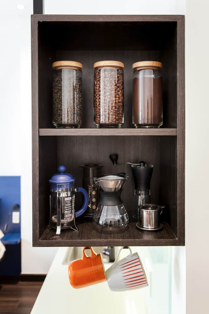 – Complimentary coffee and tea bar with several coffee and tea makers, and fresh Arabica beans and tea leaves