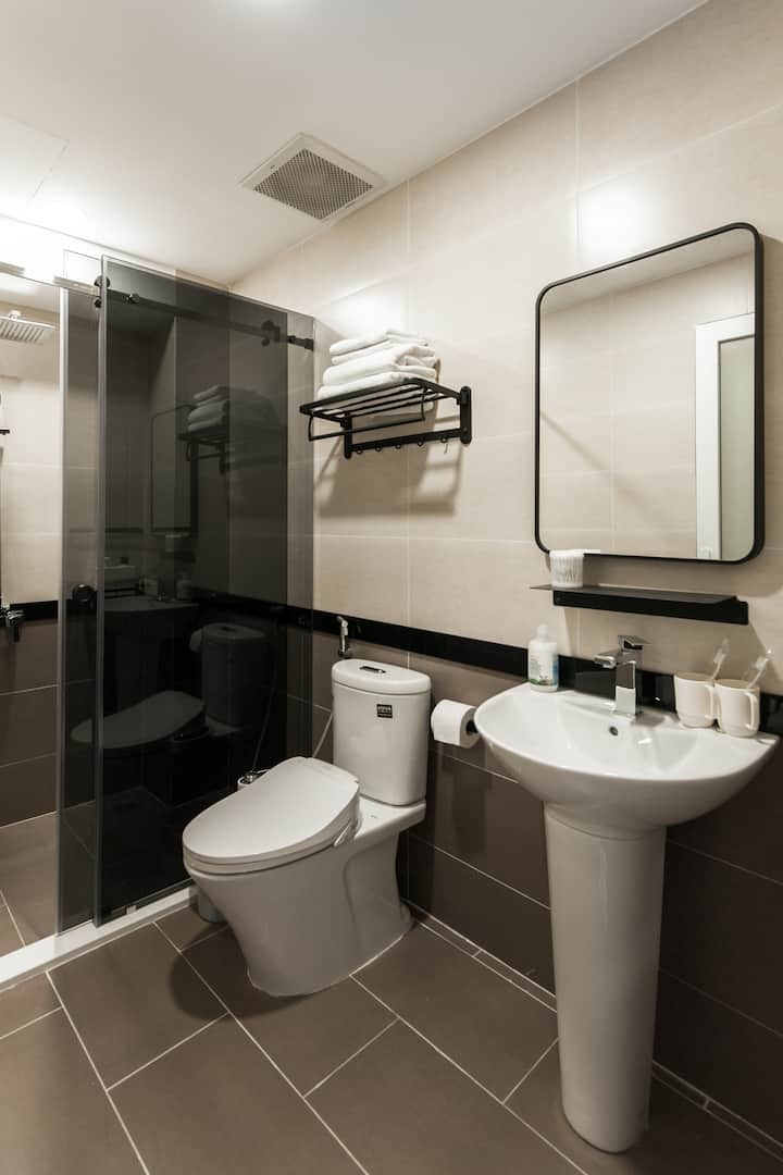 The unit features a fully equipped kitchen, spacious bathroom, balcony and all the amenities you need for a short or long stay: Netflix, bluetooth speaker, superfast wifi, & bidet toilet.