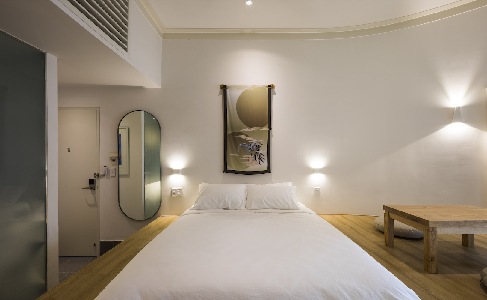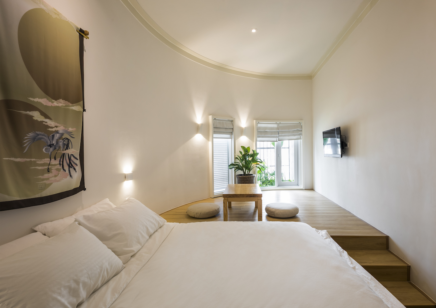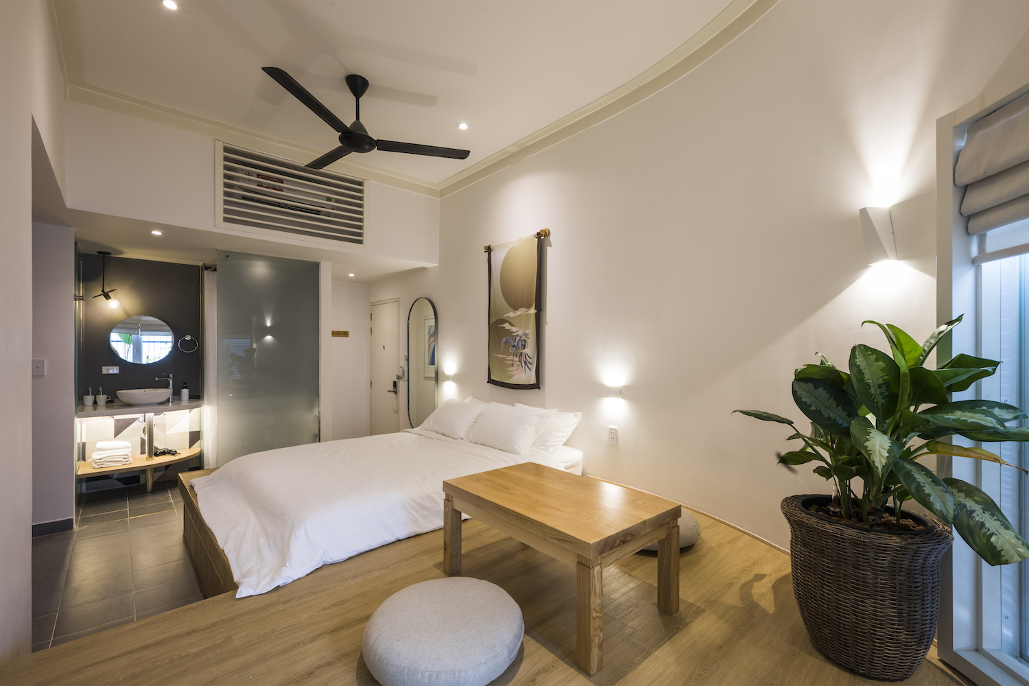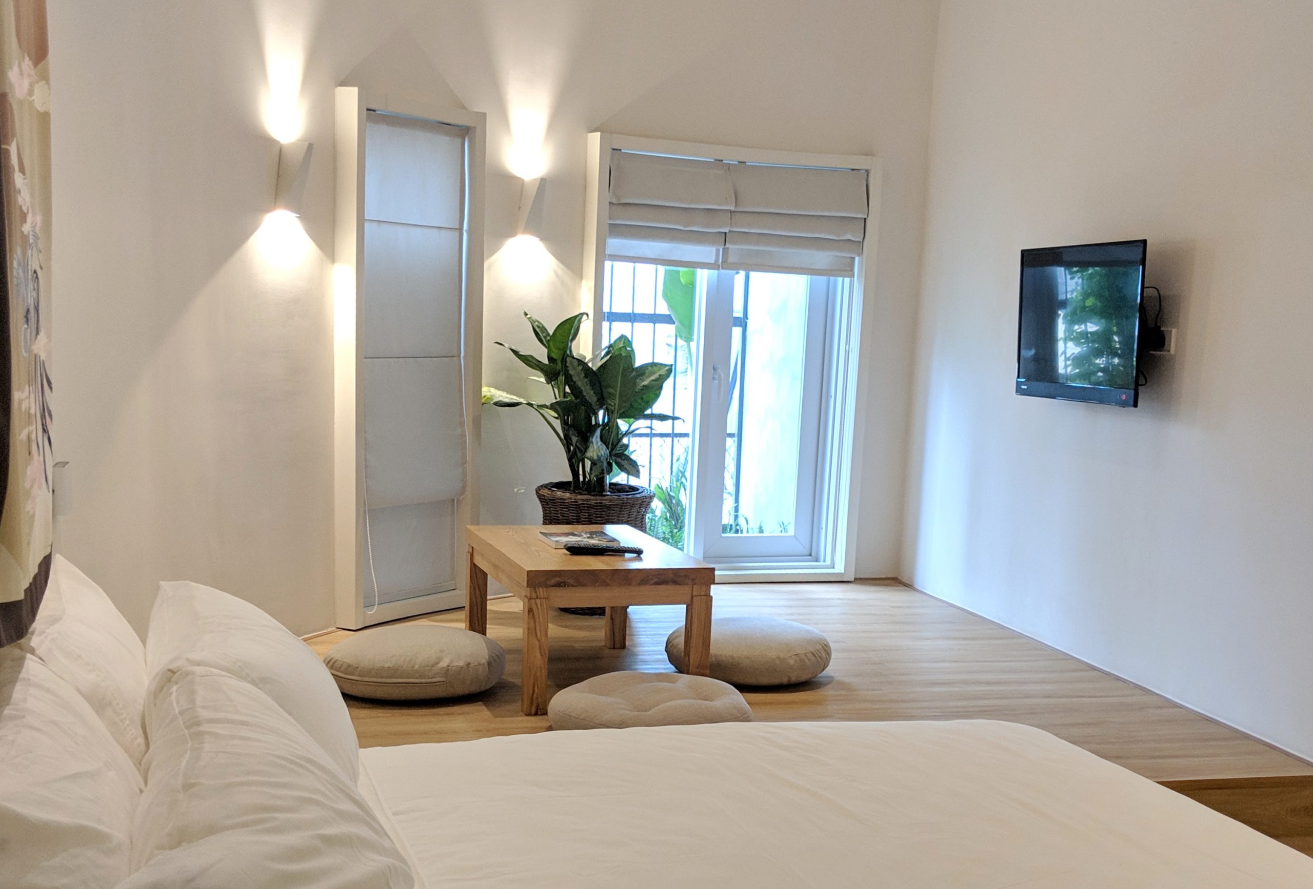 The unit itself a queen bed, tatami table and cushions, a laptop table, a full bathroom with rain shower, and fully equipped kitchen.