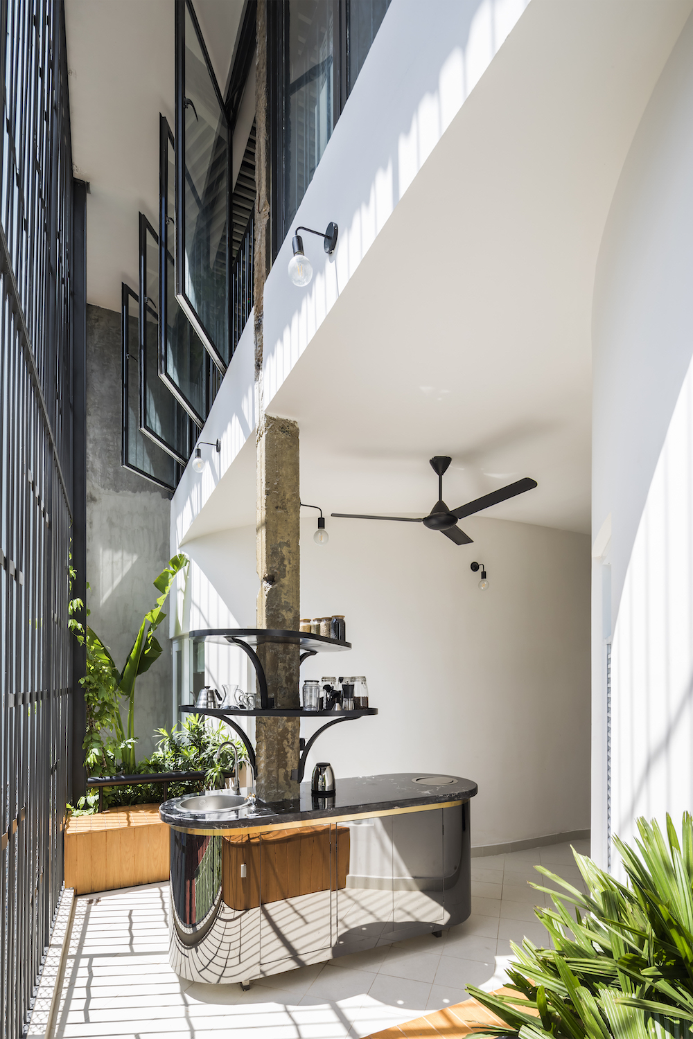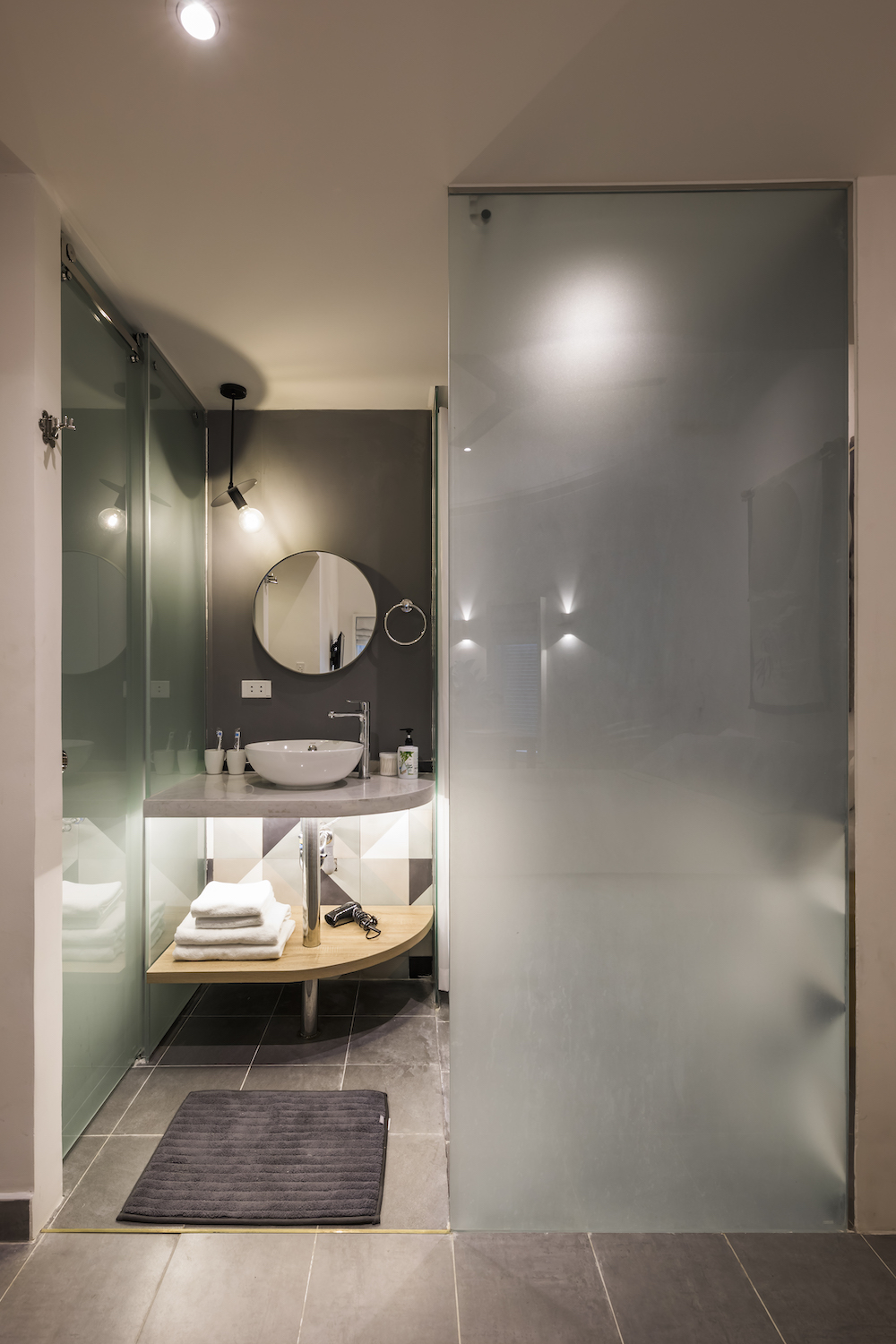 The stunning space features exposed columns, curved walls and a unique glass ceiling that fills the hallway with sunlight. Relax at the small garden and coffee lounge at the back .The unit is equipped with a luxurious bed, full kitchen, Netflix, toilet with bidet, and bath essentials—all the ingredients for a perfect stay 😉