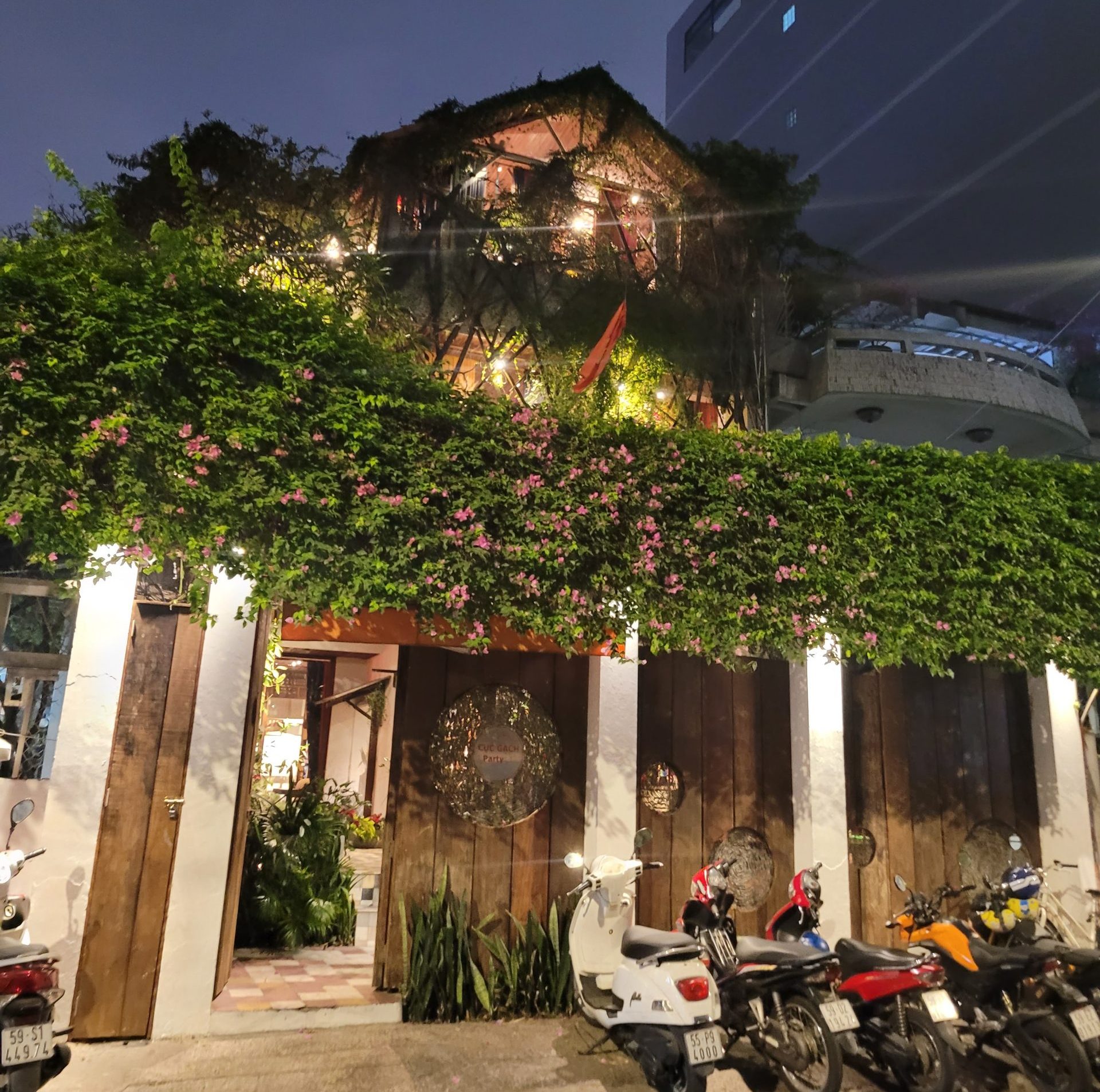 The restaurant sports two dining rooms facing each other on the same street, flanked by a supremely relaxing koi pond and leafy garden. The menu is mostly traditional Vietnamese, such as đậu hũ chiên sả ớt (deep-fried tofu with finely chopped lemongrass), and the signature canh chua cá hú fish soup, rich in tangy sweetness. Make sure you save room for desserts like deep-fried banana or the sương sâm jelly with an intense herbal flavour.