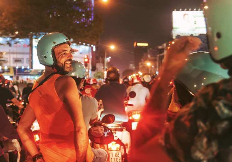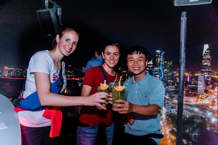 First of all, you will be taken a ride on the back of the scooter around the town and stop at a rooftop bar for  an incredible view of Saigon after dark ( a cold beer will be included ).